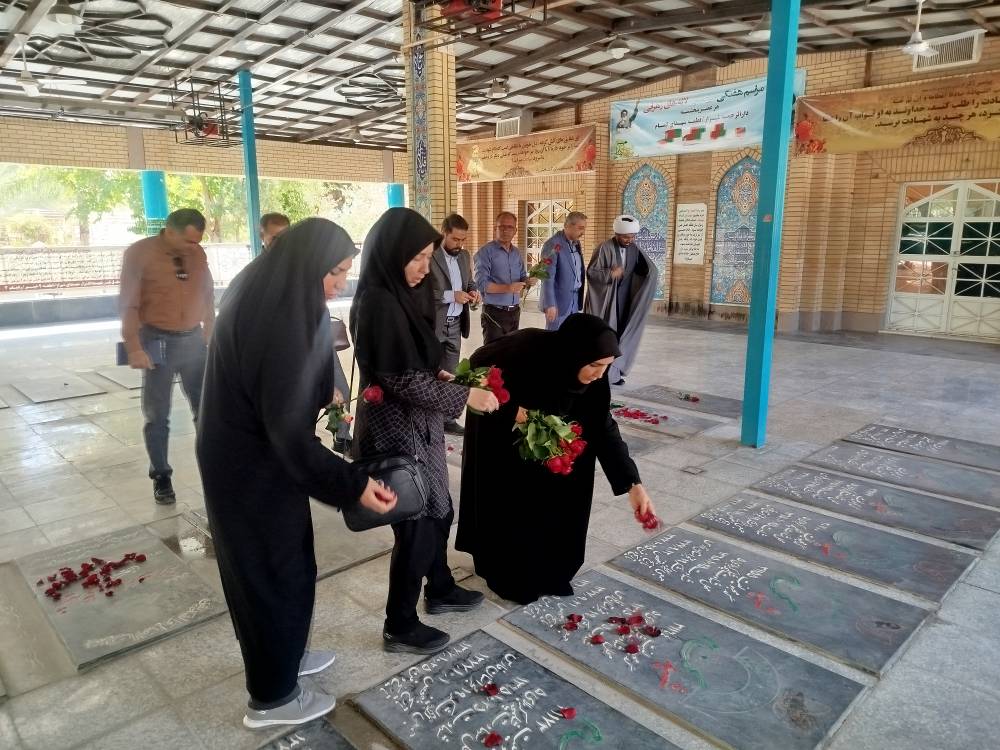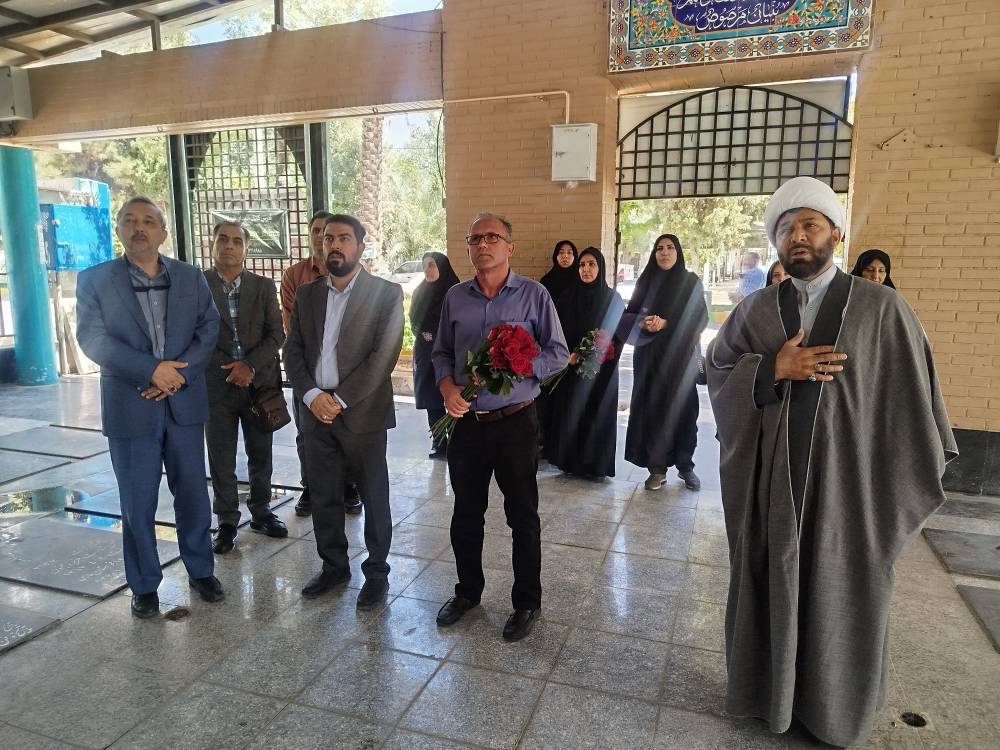کارکنان شاهد وایثارگر درمانگاه  امام رضا (ع) و شهید مطهری در قطعه شهیدان حاضر شدند و با قرائت فاتحه و نثار گل به شهدای هشت سال دفاع مقدس ادای احترام کردند.